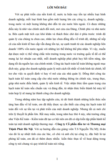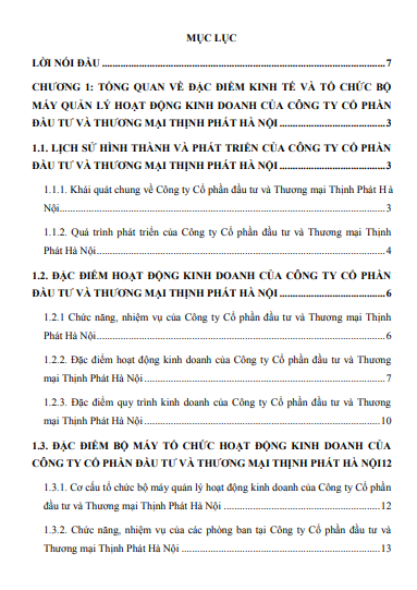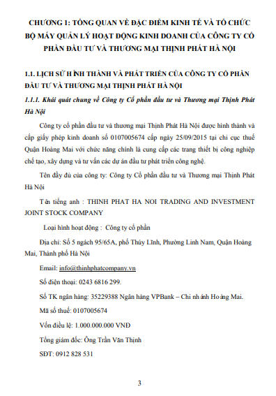Chương 1: TỔNG QUAN VỀ ĐẶC ĐIỂM KINH TẾ VÀ TỔ CHỨC BỘ MÁY QUẢN LÝ HOẠT ĐỘNG KINH DOANH CỦA CÔNG TY CỔ PHẦN ĐẦU TƯ VÀ THƯƠNG MẠI THỊNH PHÁT HÀ NỘI