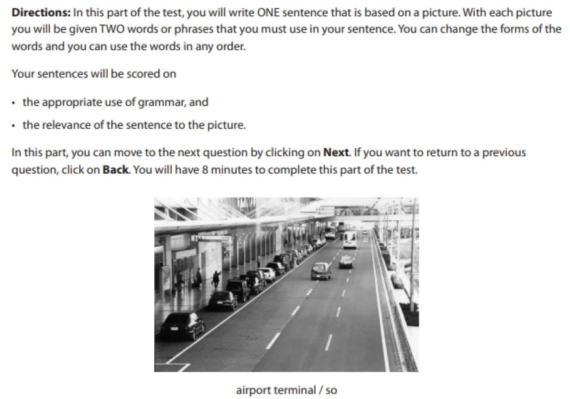 TOEIC Writing Part 1 bao gồm 5 câu hỏi miêu tả tranh. Mỗi câu hỏi sẽ kết hợp với 1 bức tranh và từ vựng gợi ý cho sẵn để thí sinh hoàn thành câu miêu tả bức tranh đó. Tổng thời gian phần thi TOEIC Writing Part 1 là 8 phút. Dưới đây là ví dụ về bài TOEIC Writing Test Part 1: