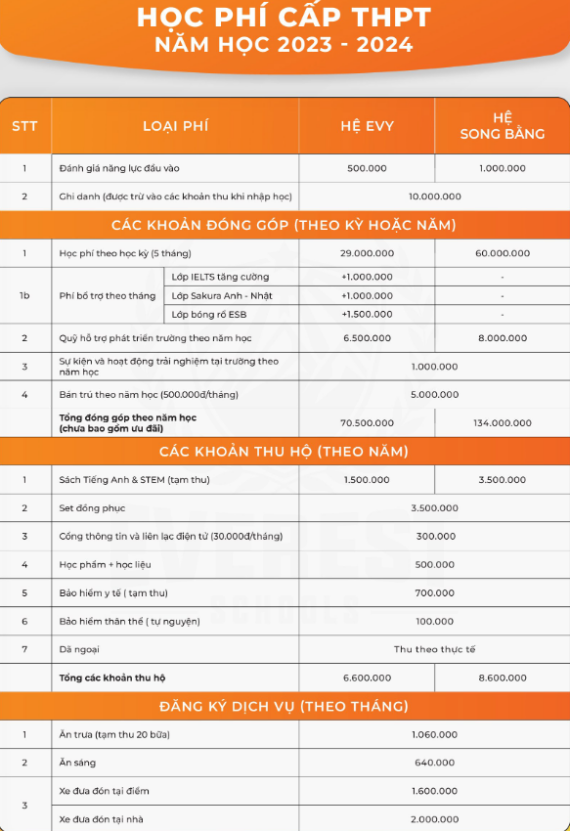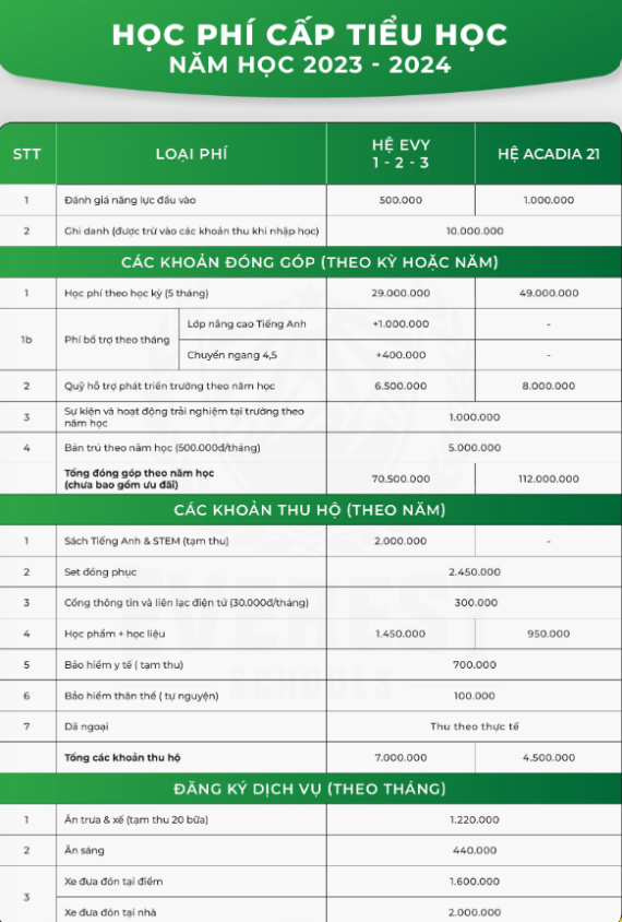 Chia làm 2 hệ: Hệ chất lượng cao EVY và hệ song ngữ Acadia21