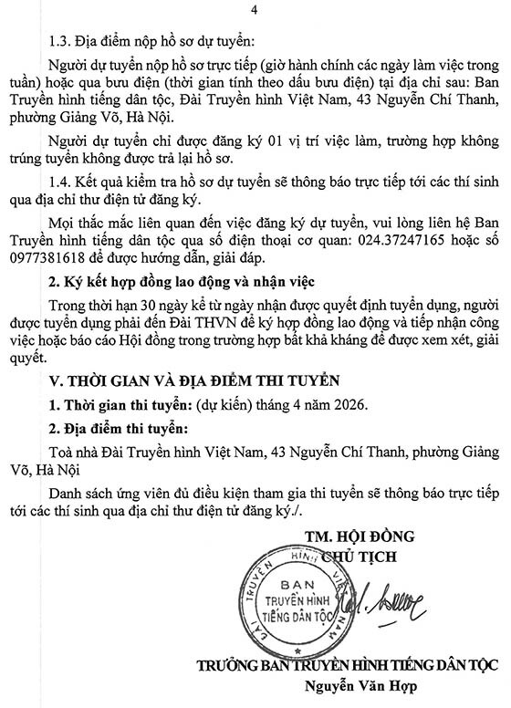 Địa điểm nộp hồ sơ dự tuyển: Người dự tuyển nộp hồ sơ trực tiếp (giờ hành chính các ngày làm việc trong tuần) hoặc qua bưu điện (thời gian tính theo dấu bưu điện) tại địa chỉ sau: Ban Truyền hình tiếng dân tộc, Đài Truyền hình Việt Nam, 43 Nguyễn Chí Thanh, phường Giảng Võ, Hà Nội. Người dự tuyển chỉ được đăng ký 01 vị trí việc làm, trường hợp không trúng tuyển không được trả lại hồ sơ.