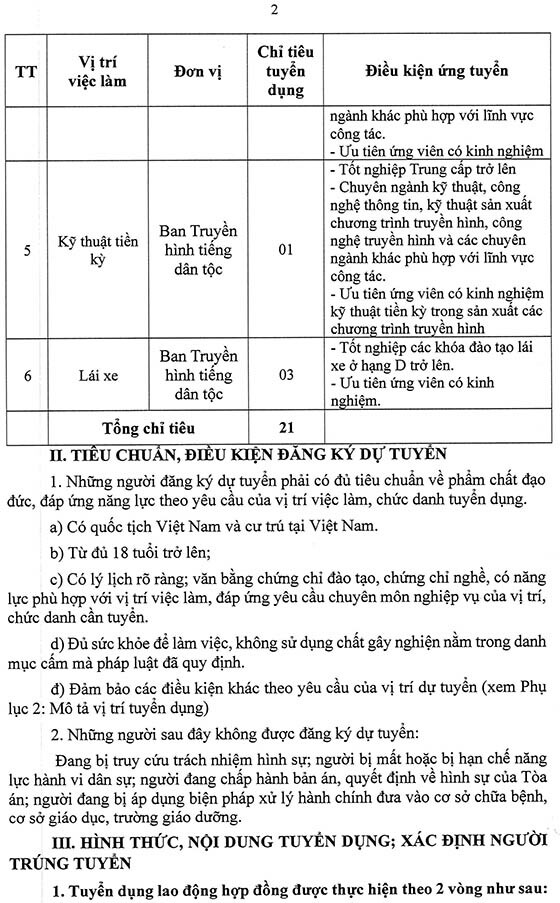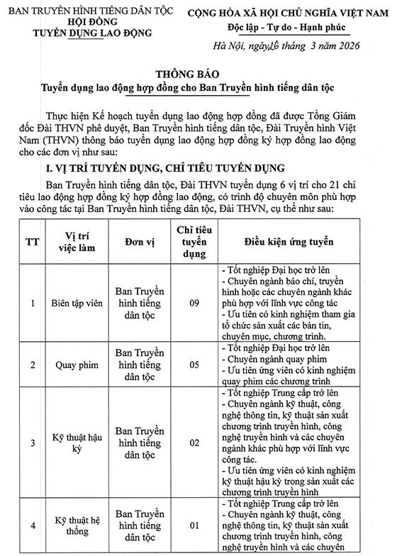 Thực hiện Kế hoạch tuyển dụng lao động hợp đồng đã được Tổng Giám đốc Đài THVN phê duyệt, Ban Truyền hình tiếng dân tộc, Đài Truyền hình Việt Nam (THVN) thông báo tuyển dụng lao động hợp đồng ký hợp đồng lao động cho các đơn vị như sau: