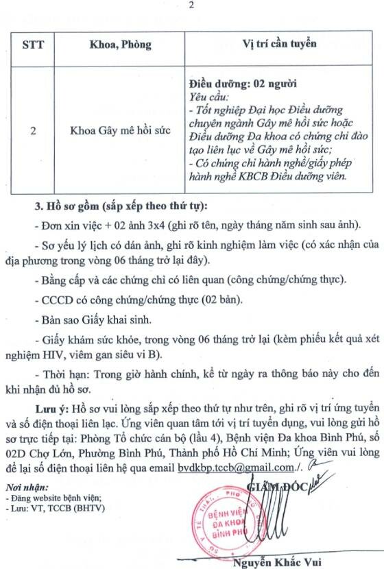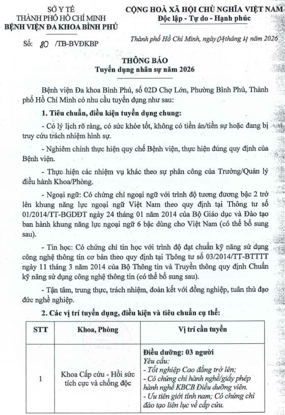 Bệnh viện Đa khoa Bình Phú, số 02D Chợ Lớn, Phường Bình Phú, Thành phố Hồ Chí Minh có nhu cầu tuyển dụng như sau: