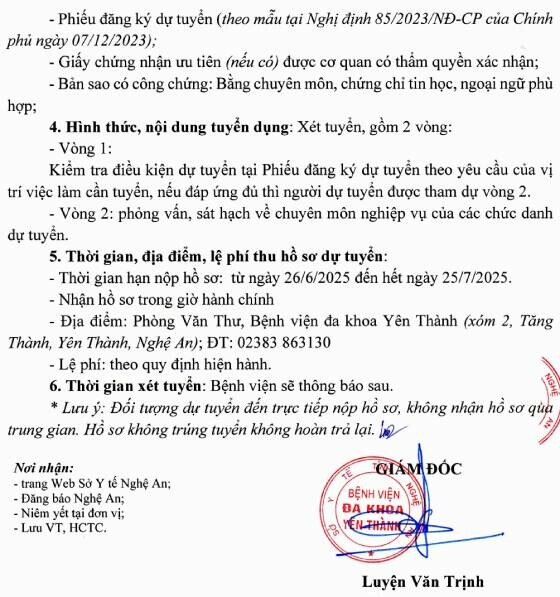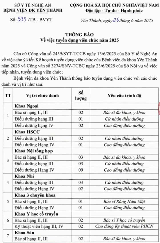 Bệnh viện đa khoa Yên Thành, Nghệ An tuyển dụng viên chức năm 2025