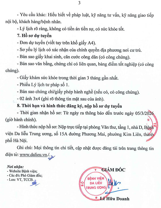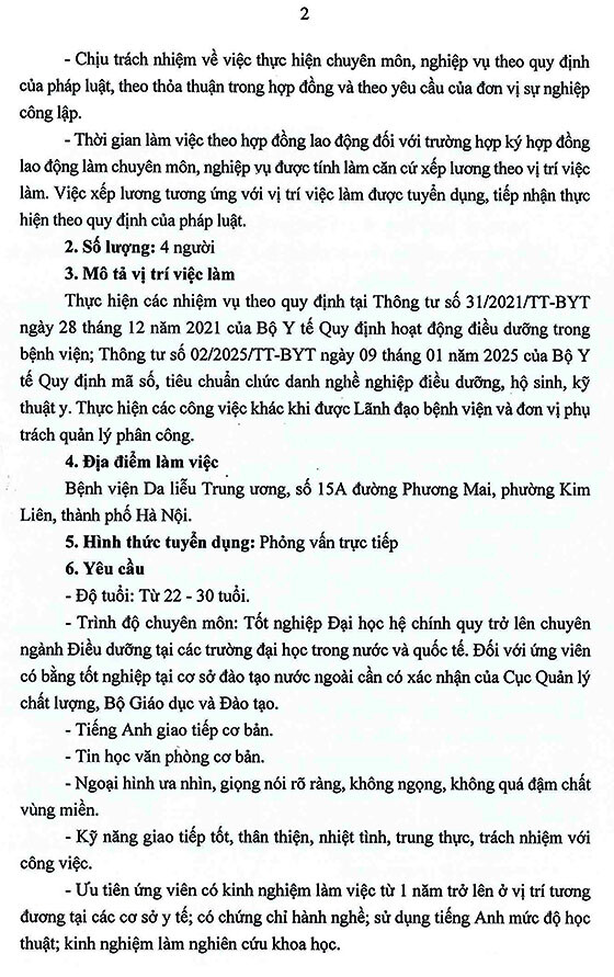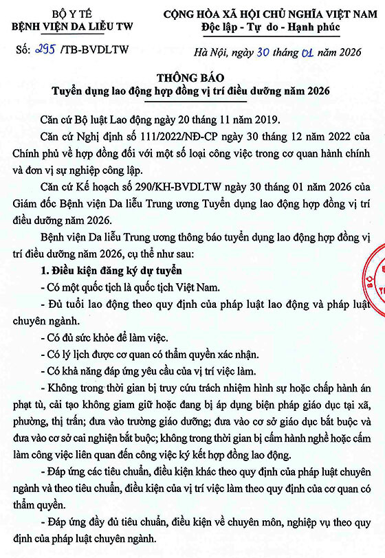 Bệnh viện Da liễu Trung ương tuyển dụng lao động hợp đồng vị trí Điều dưỡng năm 2026, cụ thể như sau: