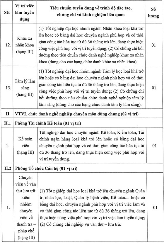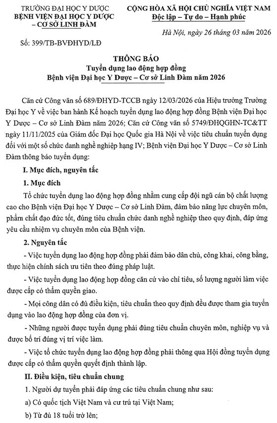 Căn cứ Công văn số 689/ĐHYD-TCCB ngày 12/03/2026 của Hiệu trưởng Trường Đại học Y về việc ban hành Kế hoạch tuyển dụng lao động hợp đồng Bệnh viện Đại học Y Dược – Cơ sở Linh Đàm năm 2026; Căn cứ Công văn số 5749/ĐHQGHN-TC&TT ngày 11/11/2025 của Giám đốc Đại học Quốc gia Hà Nội về việc tiêu chuẩn tuyển dụng đối với một số chức danh nghề nghiệp hạng IV; Bệnh viện Đại học Y Dược – Cơ sở Linh Đàm thông báo tuyển dụng như sau: