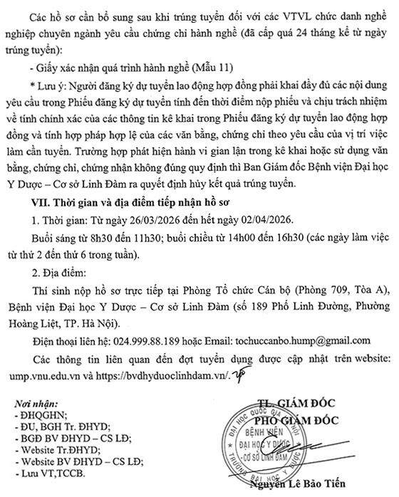 – Địa điểm: Phòng Tổ chức Cán bộ (Phòng 709, Tòa A), Bệnh viện Đại học Y Dược – Cơ sở Linh Đàm (số 189 Phố Linh Đường, Phường Hoàng Liệt, TP. Hà Nội).
