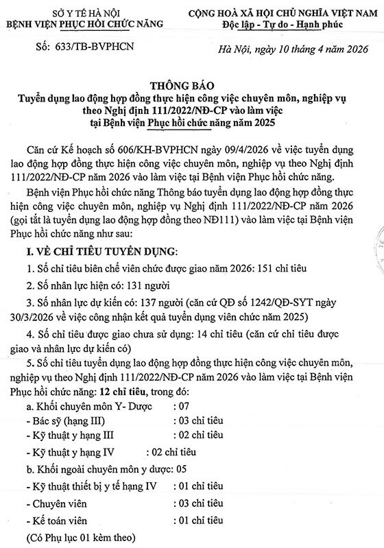 Bệnh viện Phục hồi chức năng Thông báo tuyển dụng lao động hợp đồng thực hiện công việc chuyên môn, nghiệp vụ Nghị định 111/2022/NĐ-CP năm 2026 (gọi tắt là tuyển dụng lao động hợp đồng theo NĐ111) vào làm việc tại Bệnh viện Phục hồi chức năng như sau: