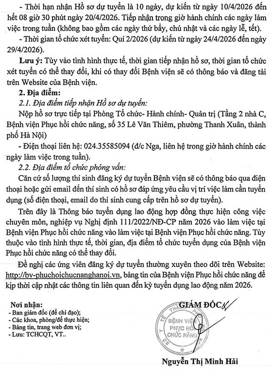 – Địa điểm: Phòng Tổ chức – Hành chính- Quản trị (Tầng 2 nhà C, Bệnh viện Phục hồi chức năng, số 35 Lê Văn Thiêm, phường Thanh Xuân, thành phố Hà Nội).