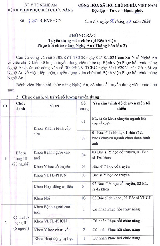 Bệnh viện Phục hồi chức năng Nghệ An, có nhu cầu tuyển dụng viên chức như sau: