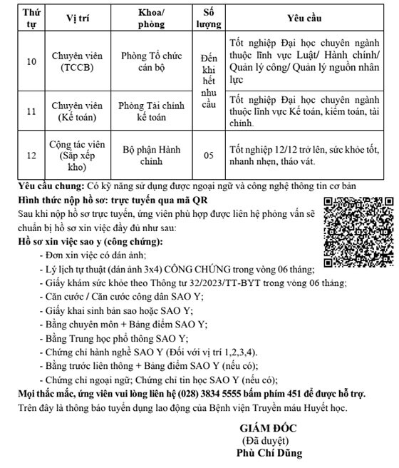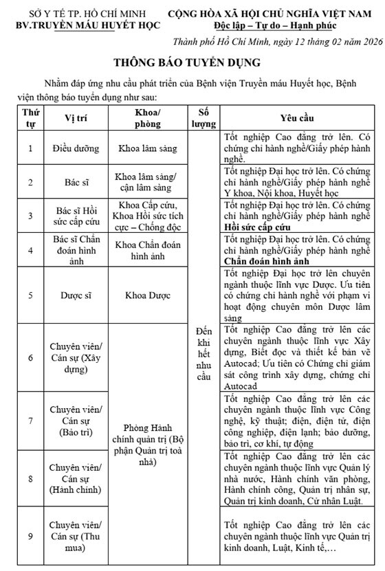 Bệnh viện Truyền máu Huyết học thông báo tuyển dụng như sau: