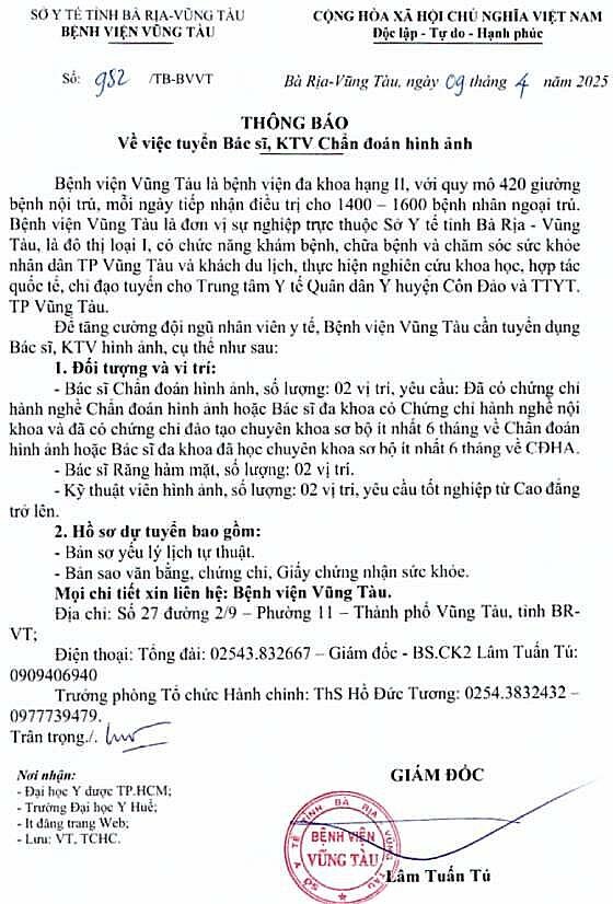 Để tăng cường đội ngũ nhân viên y tế, Bệnh viện Vũng Tàu cẩn tuyển dụng Bác sĩ, KTV hình ảnh, cụ thể như sau:
