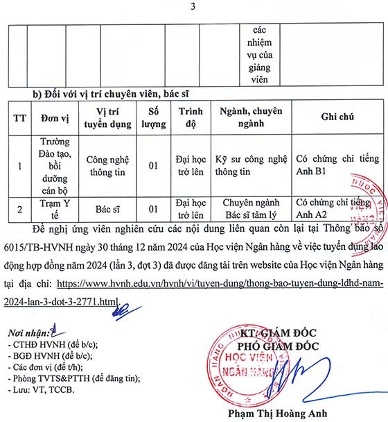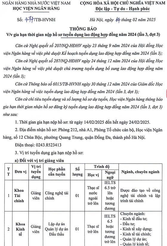 Học viện Ngân hàng thông báo gia hạn thời gian nhận hồ sơ đăng kỹ tuyển dụng lao động hợp đồng năm 2024 (lần 3, đợt 3), như sau: