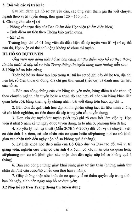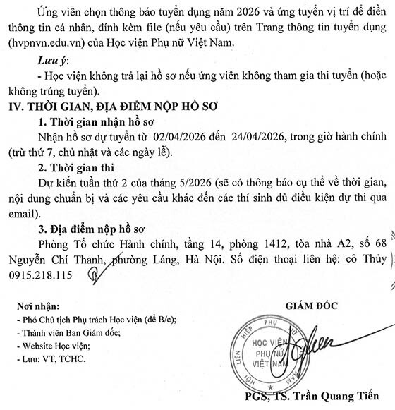 Thực hiện Nghị quyết Hội đồng Học viện và Kế hoạch tuyển dụng nhân sự năm 2026, Học viện Phụ nữ Việt Nam thông báo tuyển dụng như sau: