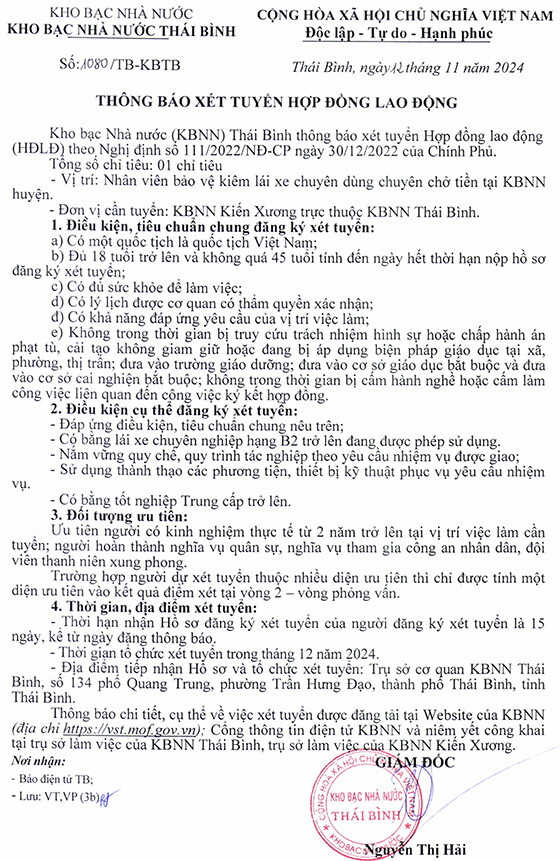 Kho bạc Nhà nước (KBNN) Thái Bình thông báo xét tuyển Hợp đồng lao động (HĐLĐ) theo Nghị định số 111/2022/NĐ-CP ngày 30/12/2022 của Chính Phủ.