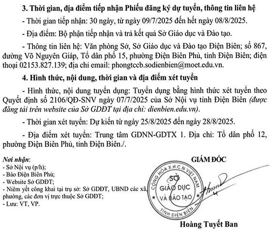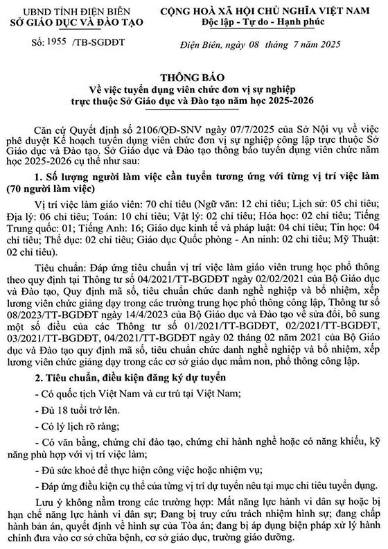 Sở GD&ĐT Điện Biên tuyển dụng viên chức năm học 2025-2026