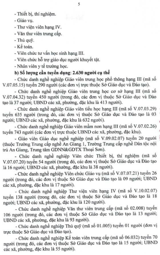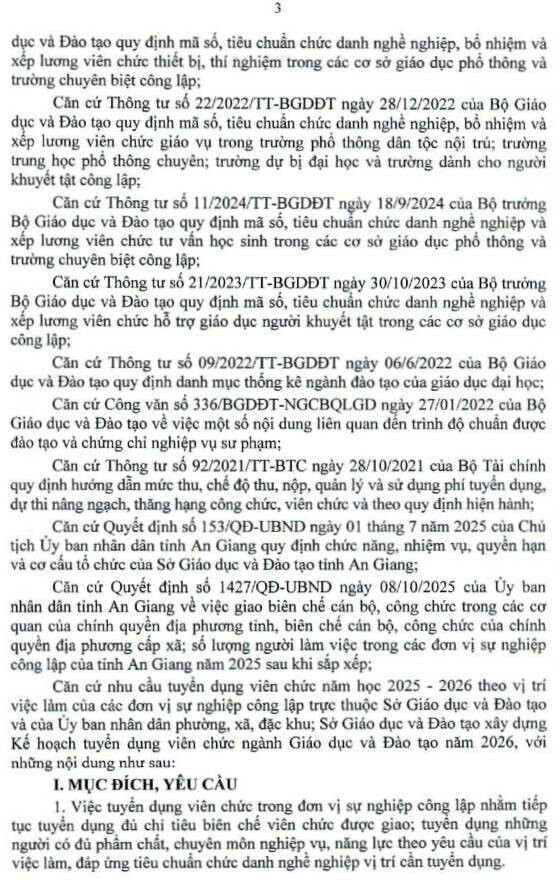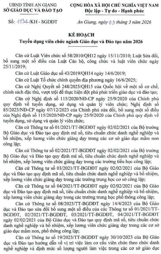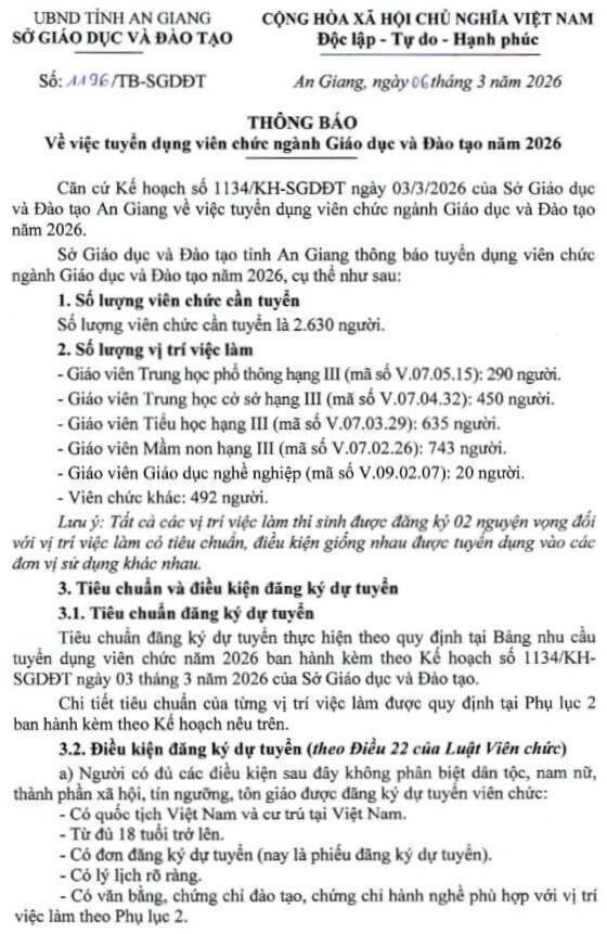 Sở Giáo dục và Đào tạo tỉnh An Giang thông báo tuyển dụng viên chức ngành Giáo dục và Đào tạo năm 2026, cụ thể như sau:
