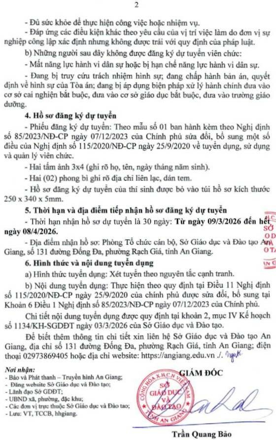 Sở GD&ĐT tỉnh An Giang tuyển dụng viên chức năm 2026
