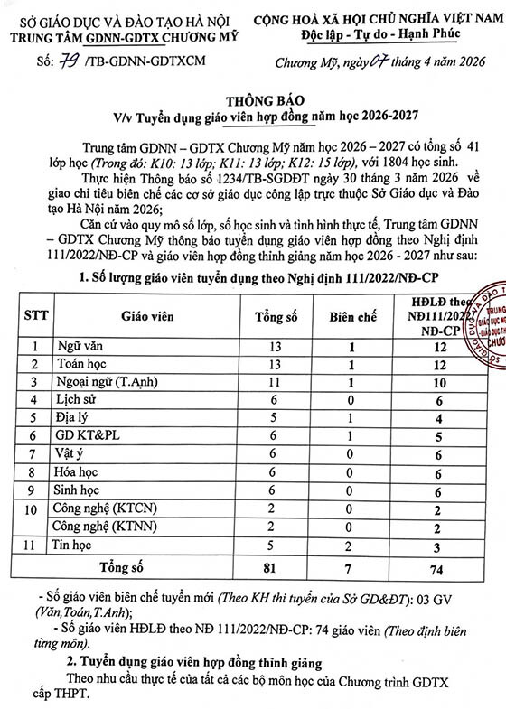 Trung tâm GDNN – GDTX Chương Mỹ thông báo tuyển dụng giáo viên hợp đồng và thỉnh giảng ở nhiều bộ môn như: Toán, Văn, Tiếng Anh, Lý, Hóa, Sinh, Tin học…