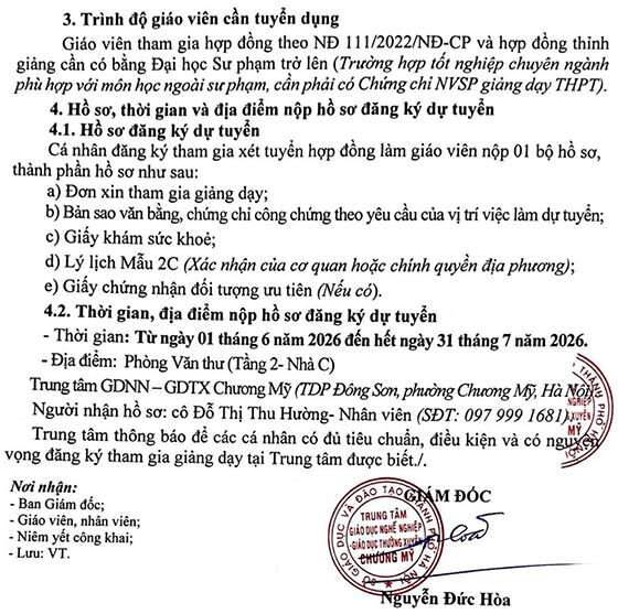 Trung tâm GDNN – GDTX Chương Mỹ, Hà Nội tuyển dụng giáo viên hợp đồng