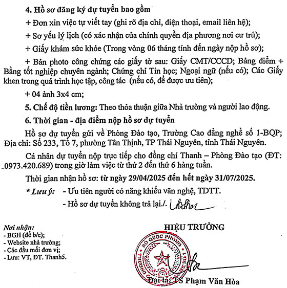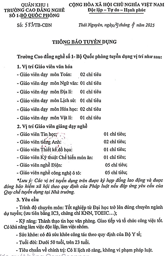 Trường Cao đẳng nghề số 1- Bộ Quốc phòng tuyển dụng vị trí như sau: