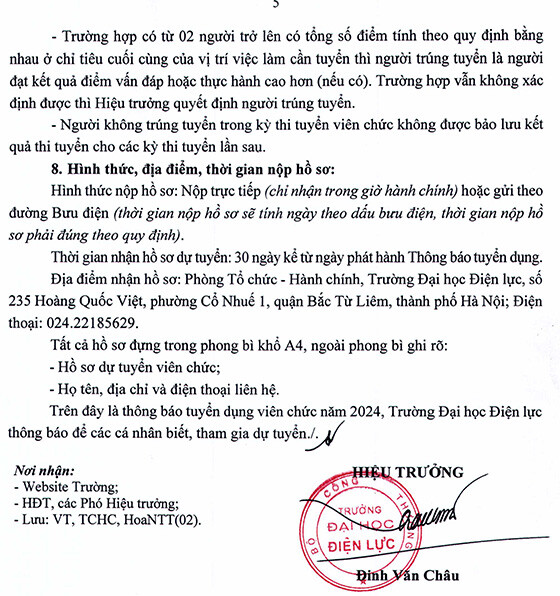 Địa điểm nhận hồ sơ: Phòng Tổ chức – Hành chính, Trường Đại học Điện lực, số 235 Hoàng Quốc Việt, phường Cổ Nhuế 1, quận Bắc Từ Liêm, thành phố Hà Nội; Điện thoại: 024.22185629.
