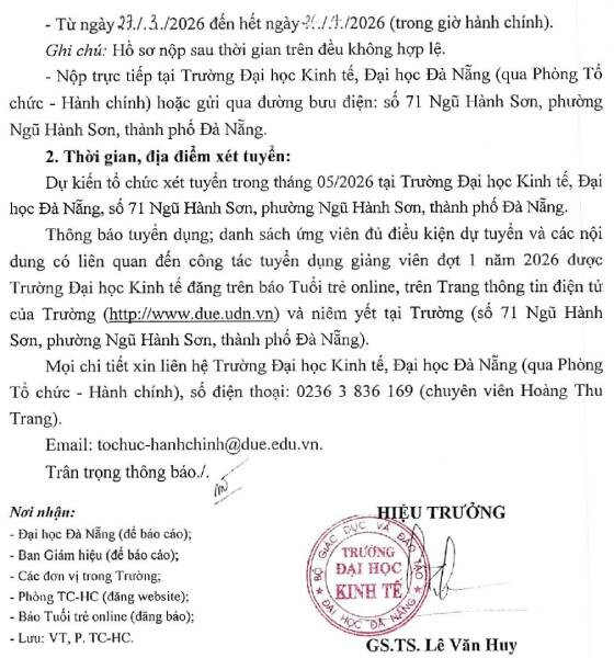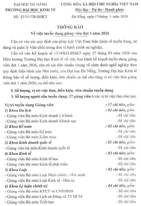 Trường Đại học Kinh tế, Đại học Đà Nẵng thông báo tuyển dụng giảng viên đợt 1 năm 2026, cụ thể như sau: