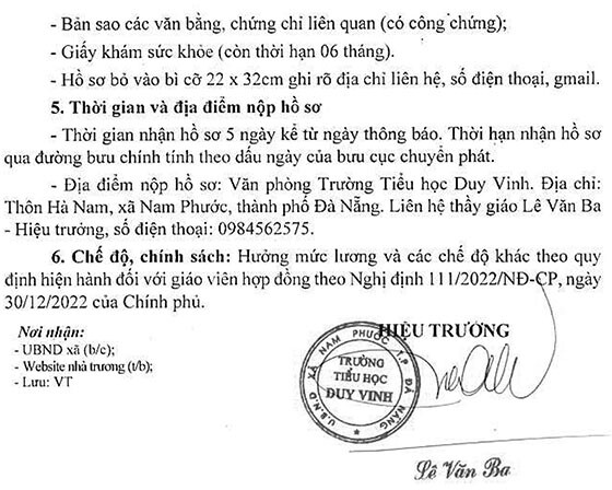 – Địa điểm: Văn phòng Trường Tiểu học Duy Vinh. Địa chỉ: Thôn Hà Nam, xã Nam Phước, thành phố Đà Nẵng