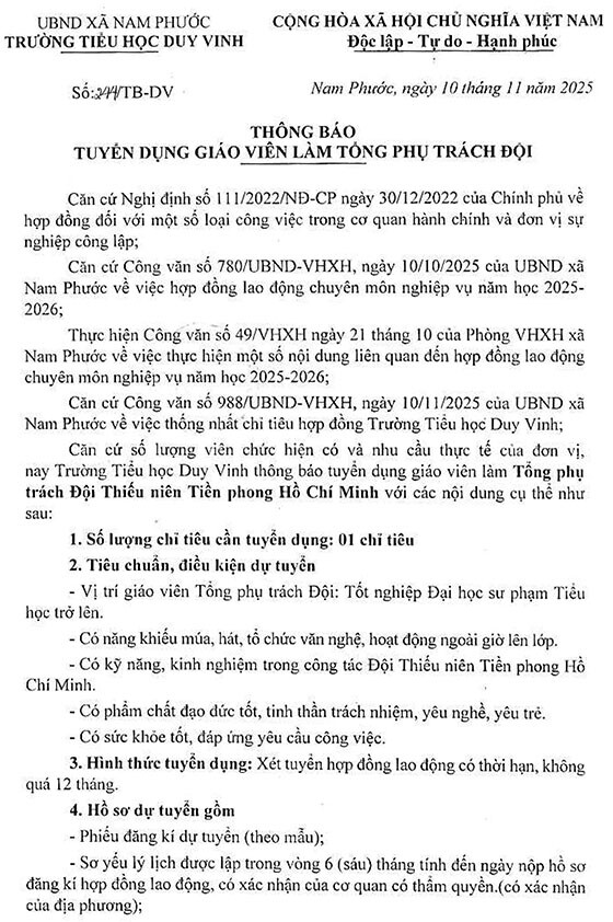 Căn cứ số lượng viên chức hiện có và nhu cầu thực tế của đơn vị, nay Trường Tiểu học Duy Vinh thông báo tuyển dụng giáo viên làm Tổng phụ trách Đội Thiếu niên Tiền phong Hồ Chí Minh với các nội dung cụ thể như sau: