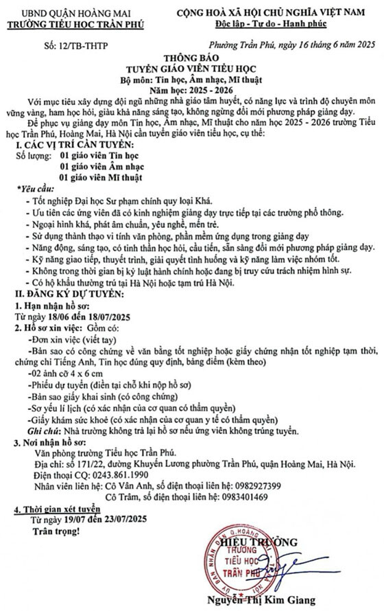 Để phục vụ giảng dạy môn Tin học, Âm nhạc, Mĩ thuật cho năm học 2025 – 2026 trường Tiểu học Trần Phú, Hoàng Mai, Hà Nội cần tuyển giáo viên tiểu học, cụ thể: