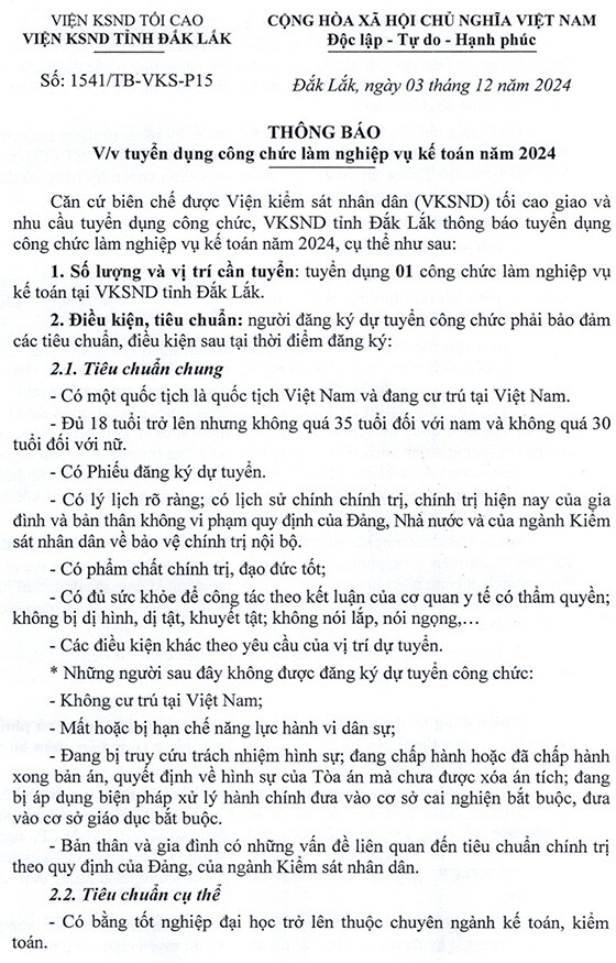 Căn cứ biên chế được Viện kiểm sát nhân dân (VKSND) tối cao giao và nhu cầu tuyển dụng công chức, VKSND tỉnh Đắk Lắk thông báo tuyển dụng công chức làm nghiệp vụ kế toán năm 2024, cụ thể như sau: