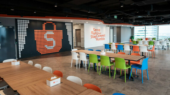 Shopee, sàn thương mại điện tử hàng đầu Đông Nam Á, có văn phòng tại Hà Nội rộng 2.000m², đáp ứng cho 200 nhân viên. Thiết kế văn phòng mang đậm tinh thần Shopee, với tông màu cam chủ đạo, tạo không gian làm việc vui vẻ và tràn đầy năng lượng.