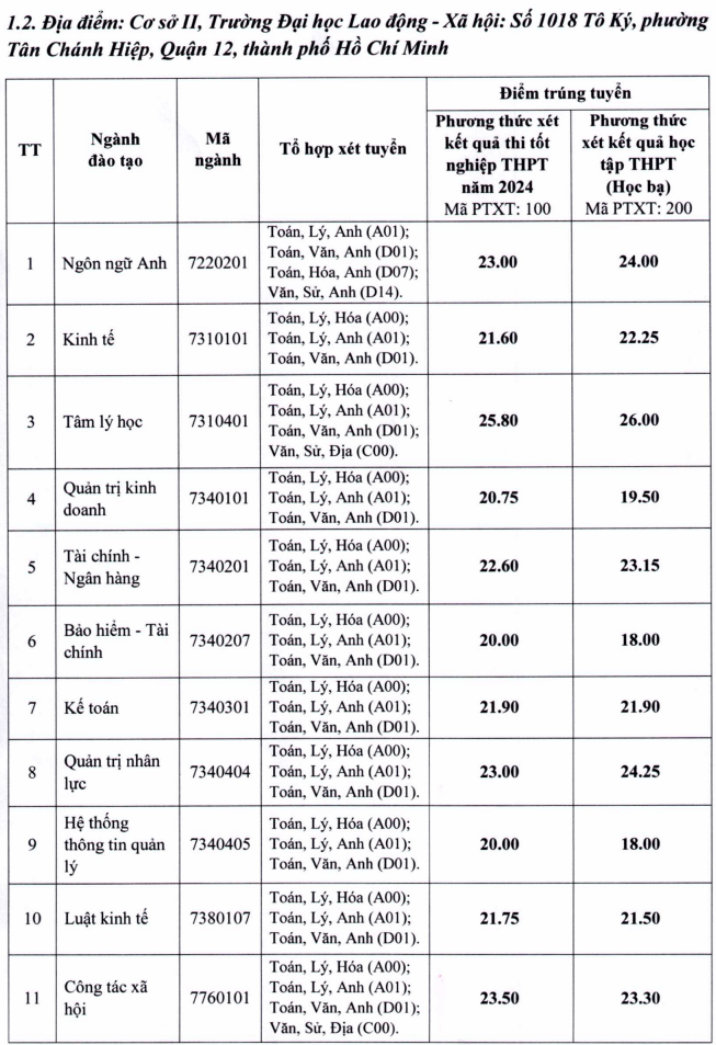 Trường Đại học Lao động - Xã hội thông báo điểm trúng tuyển đại học hệ chính quy xét tuyển dựa trên kết quả thi tốt nghiệp THPT năm 2024 và dựa trên kết quả học tập THPT (học bạ) như sau: