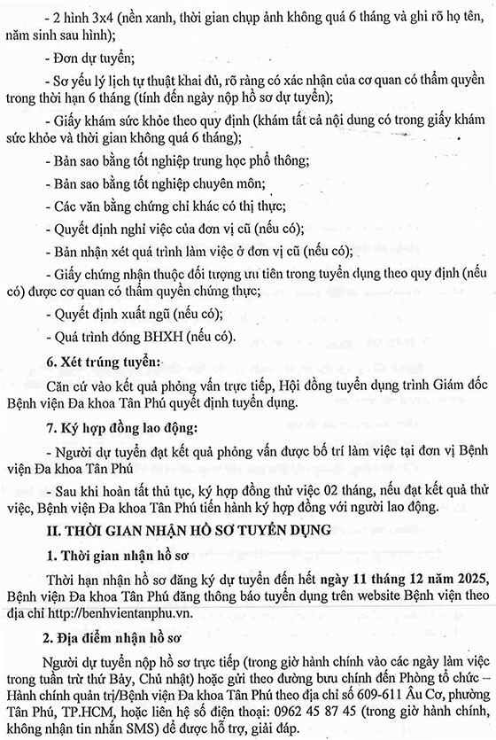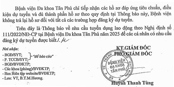 Bệnh viện Đa khoa Tân Phú, TP. HCM tuyển dụng lao động năm 2025