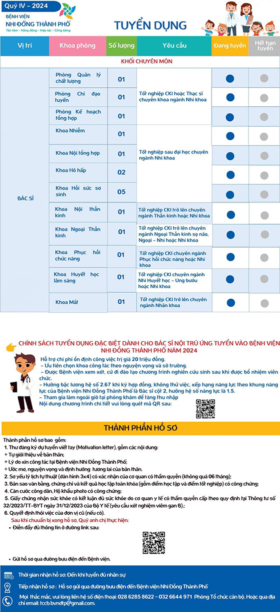 Bệnh viện Nhi Đồng thành phố thông báo tuyển dụng nhân sự Qúy IV năm 2024, như sau:
