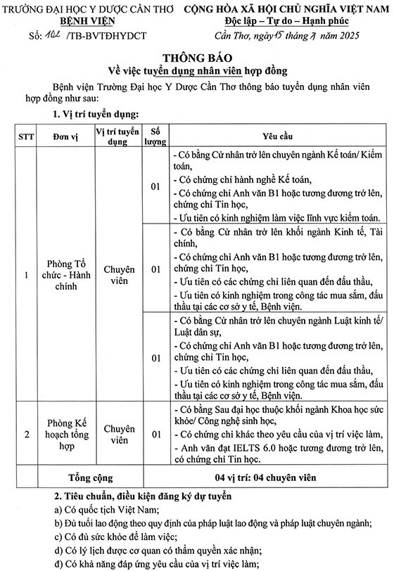 Bệnh viện Trường Đại học Y Dược Cần Thơ thông báo tuyển dụng nhân viên hợp đồng như sau:
