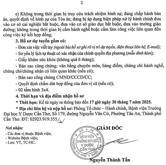 – Địa điểm: Phòng Tổ chức – Hành chính, Bệnh viện Trường Đại học Y Dược Cần Thơ, Số 179, đường Nguyễn Văn Cừ, Phường Tân An, Thành phố Cần Thơ. ĐT: 02923.919.555./