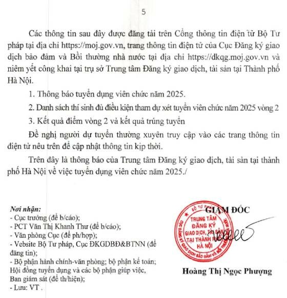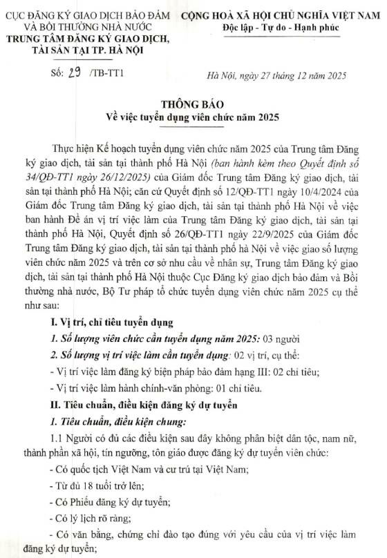 Trung tâm Đăng ký giao dịch, tải sản tại TP. Hà Nội thuộc Cục Đăng ký giao dịch bảo đảm và Bồi thường nhà nước, Bộ Tư pháp tuyển dụng viên chức năm 2025