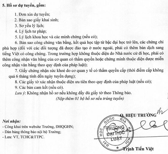 – Địa điểm: Phòng Tổ chức, Hành chính và Thanh tra pháp chế, Trường Đại học Luật, Đại học Quốc gia Hà Nội (P.305 nhà E1, 144 Xuân Thủy, Hà Nội)