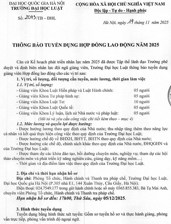 Trường Đại học Luật – ĐHQGHN tuyển dụng giảng viên Hợp đồng lao động