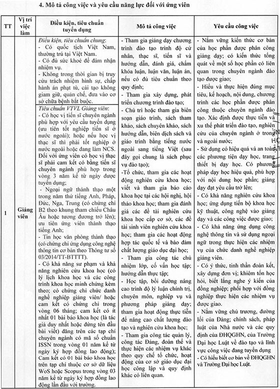 Căn cứ Kế hoạch phát triển nhân lực năm 2025 đã được Tập thể lãnh đạo Trường phê duyệt và định biên nhân lực đội ngũ giảng viên, Trường Đại học Luật thông báo tuyển dụng giảng viên Hợp đồng lao động cho các vị tí sau: