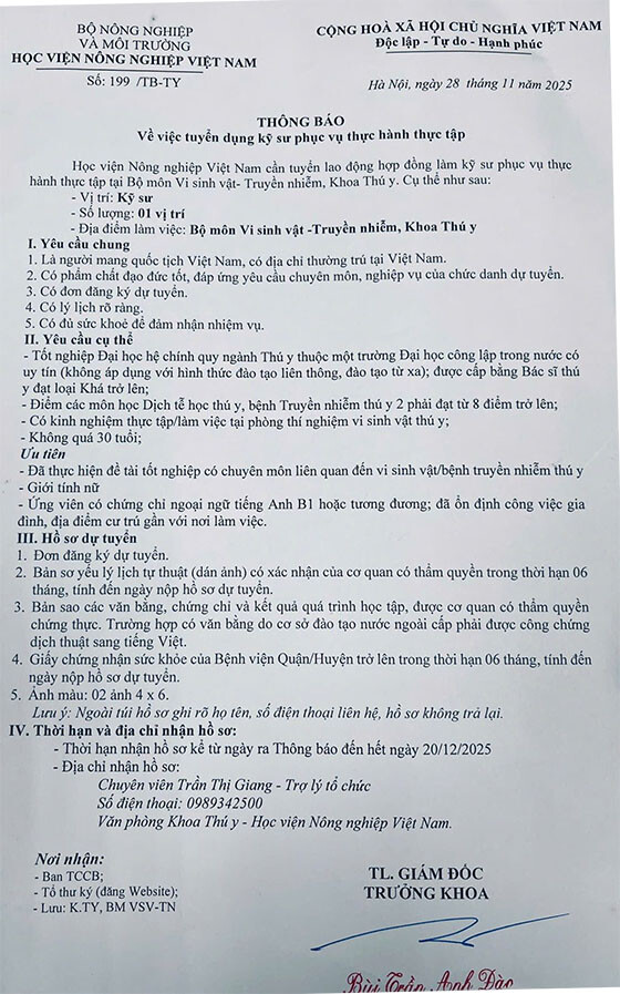 Học viện Nông nghiệp Việt Nam cần tuyển lao động hợp đồng làm kỹ sư phục vụ thực hành thực tập tại Bộ môn Vi sinh vật – Truyền nhiễm, Khoa Thú y. Cụ thể như sau:
