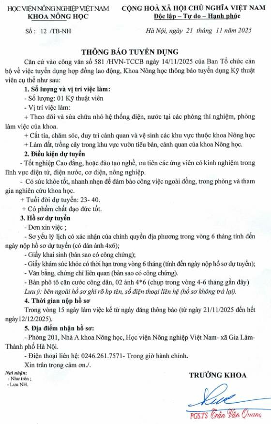 Căn cứ vào công văn số 581 /IVN-TCCB ngày 14/11/2025 của Ban Tổ chức cán bộ về việc tuyển dụng hợp đồng lao động, Khoa Nông học thông báo tuyển dụng Kỹ thuật viên cụ thể như sau;
