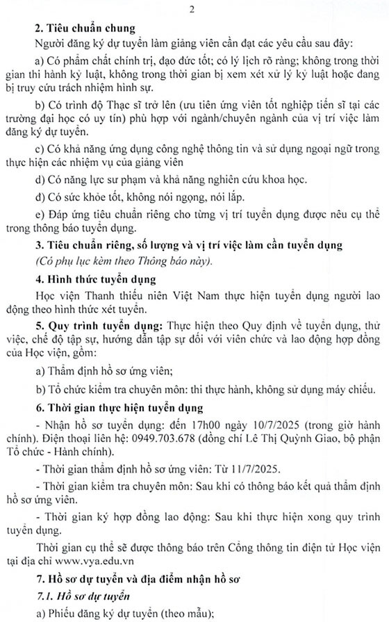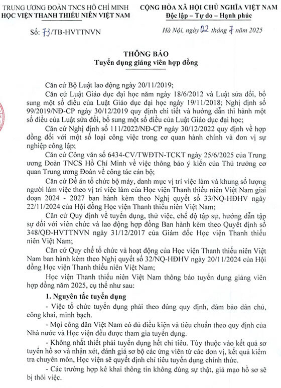 Học viện Thanh thiếu niên Việt Nam thông báo tuyển dụng giảng viên hợp đồng năm 2025, cụ thể như sau: