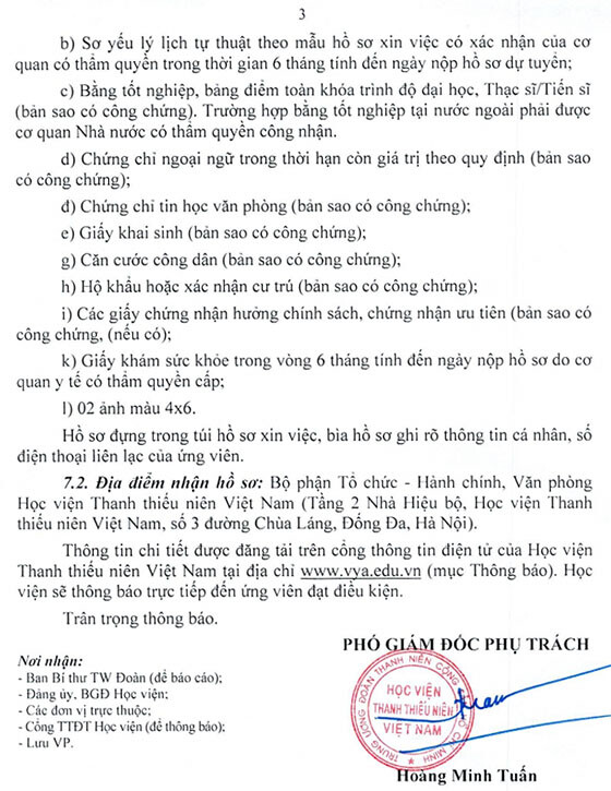 – Địa điểm: Bộ phận Tổ chức – Hành chính, Văn phòng, Học viện Thanh thiếu niên Việt Nam (Tầng 2 Nhà hiệu bộ, Học viện Thanh thiếu niên Việt Nam, số 3 đường Chùa Láng, Đống Đa, Hà Nội).