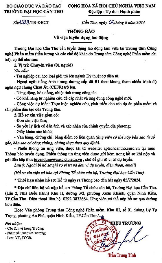 Trường Đại học Cần Thơ tuyển dụng lao động năm 2024, như sau:
