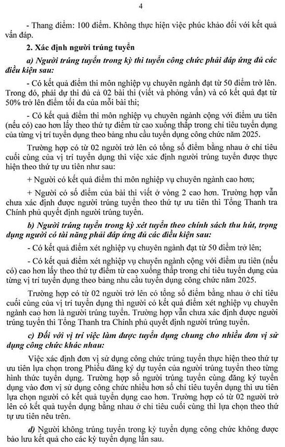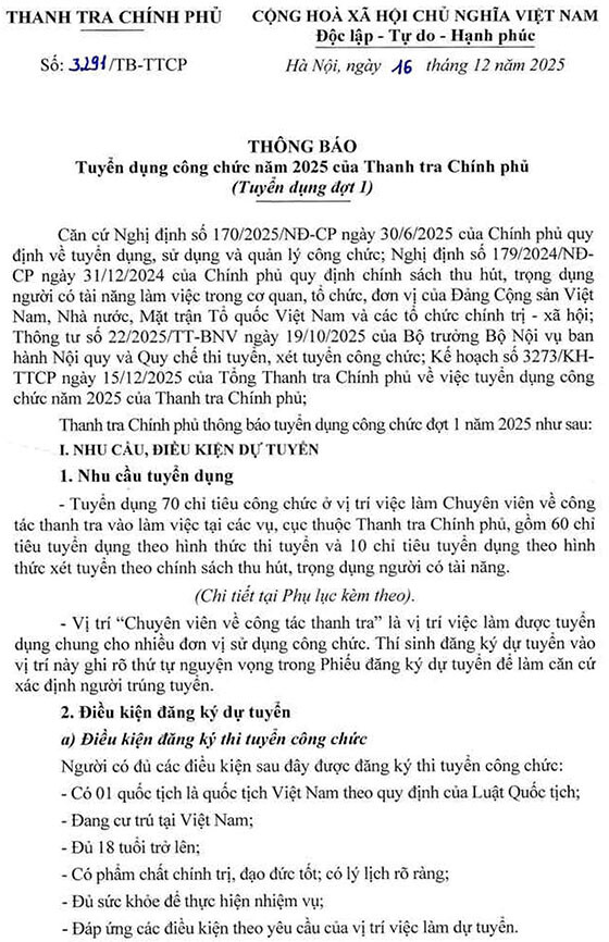Thanh tra Chính phủ thông báo tuyển dụng công chức đợt 1 năm 2025 như sau: