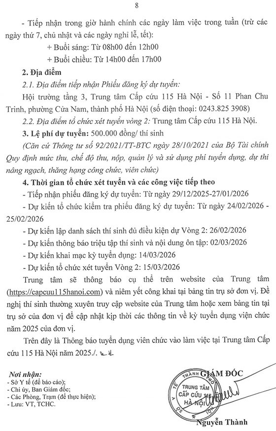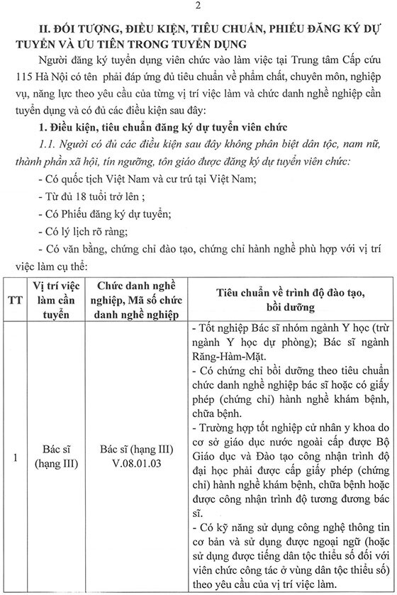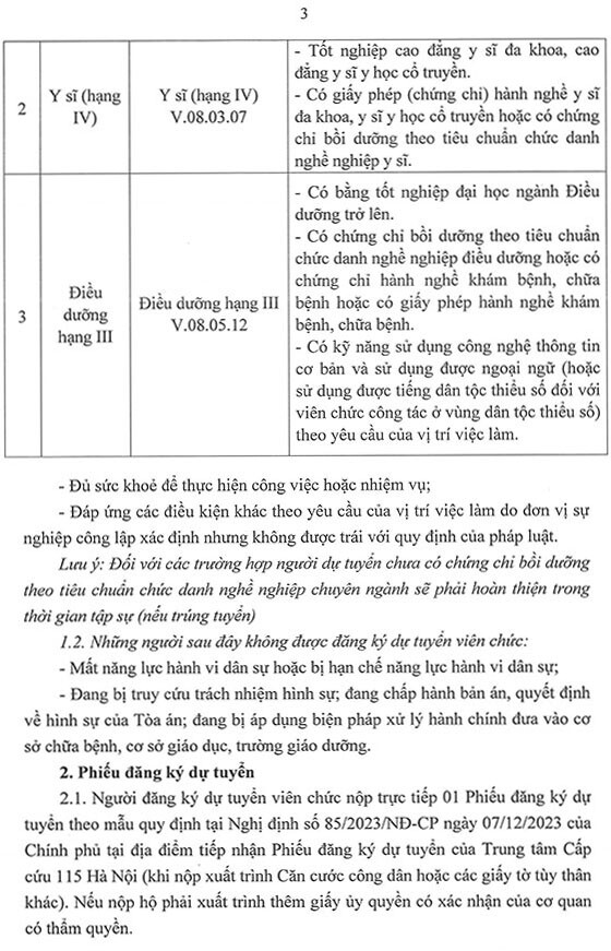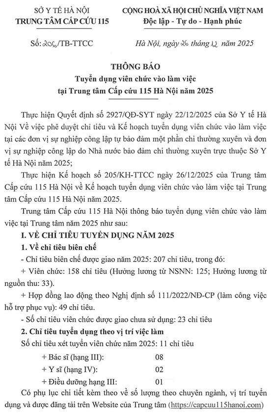 Trung tâm Cấp cứu 115 Hà Nội thông báo tuyển dụng viên chức vào làm việc tại Trung tâm năm 2025 như sau:
