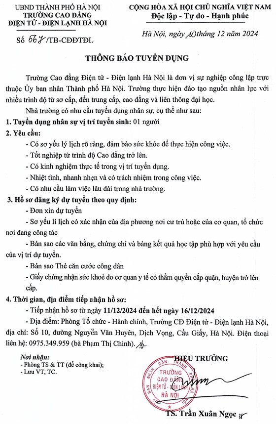 Trường Cao đẳng Điện tử – Điện lạnh Hà Nội là đơn vị sự nghiệp công lập trực thuộc Ủy ban nhân Thành phố Hà Nội. Trường thực hiện đào tạo nguồn nhân lực với nhiều trình độ từ sơ cắp, đến trung cấp, cao đẳng và liên thông đại học. Nhà trường có nhu cầu tuyển dụng nhân sự, cụ thể như sau:
