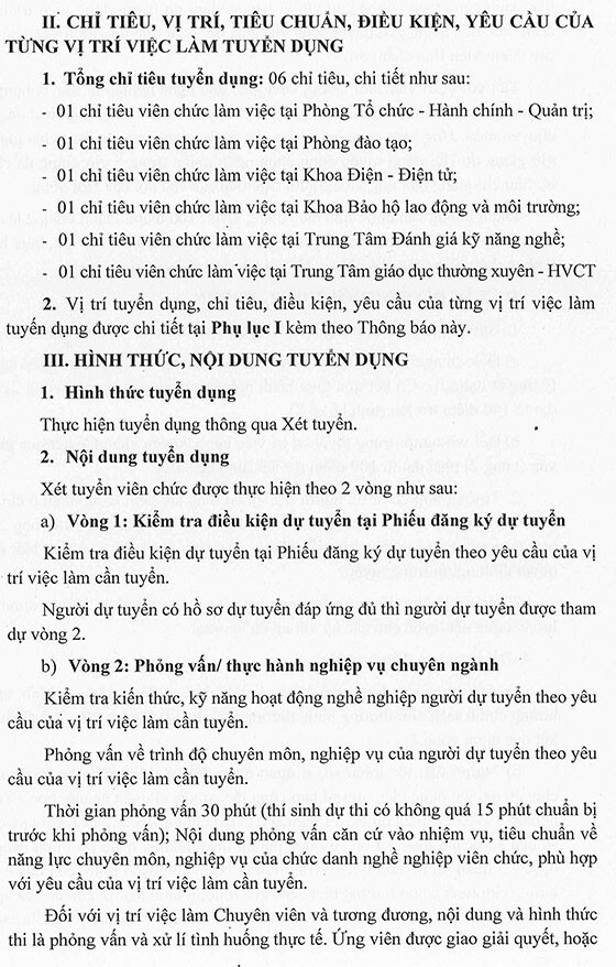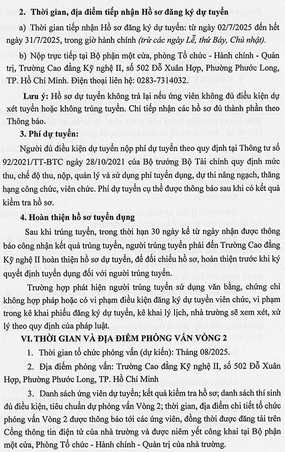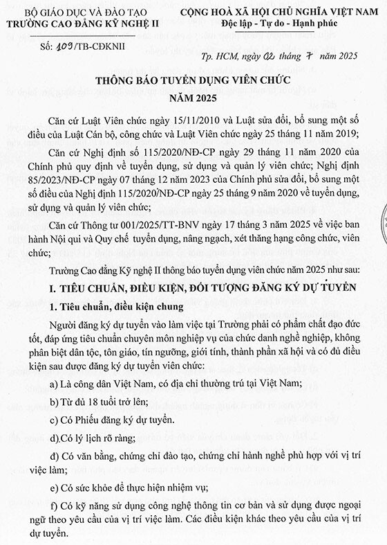 Trường Cao đẳng Kỹ nghệ II thông báo tuyển dụng viên chức năm 2025 như sau: