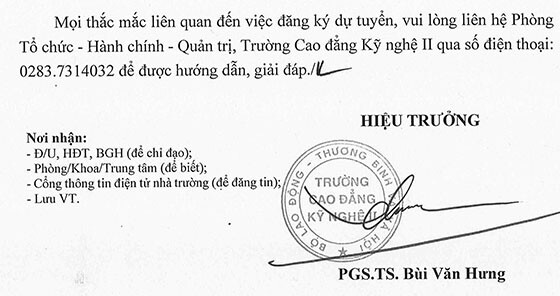 – Địa điểm: Bộ phận một cửa, phòng Tổ chức – Hành chính – Quản trị, Trường Cao đẳng Kỹ nghệ II, số 502 Đỗ Xuân Hợp, Phường Phước Long, TP. Hồ Chí Minh.